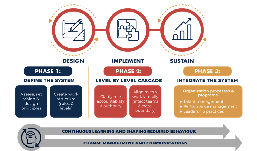 Once a design is selected implementation activities start, beginning with the detailed work of building out the new organization. Leaders take the high-level organization design and identify the roles required at every level, cascading the structure down to the frontline. Final decisions are made regarding the number of layers required, grouping of functions, and the nesting of systems, and processes. The organization will have new roles but will also retain many roles that currently exist, although the work of these roles may change.