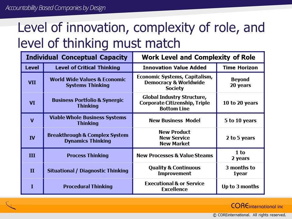 This critical capability to harness innovation needs to be built into organizations. The ability to foster innovative ideas has no economic value without having people and systems to bring these innovations to the marketplace. To capture value, organizations must build the accountability for innovation into roles. Sustainable and scalable innovation for growth requires a variety of expertise and capabilities—different roles doing different work at different levels throughout the organization working to bring new innovations to market. The chart below illustrates where these values creation elements reside within organizations.